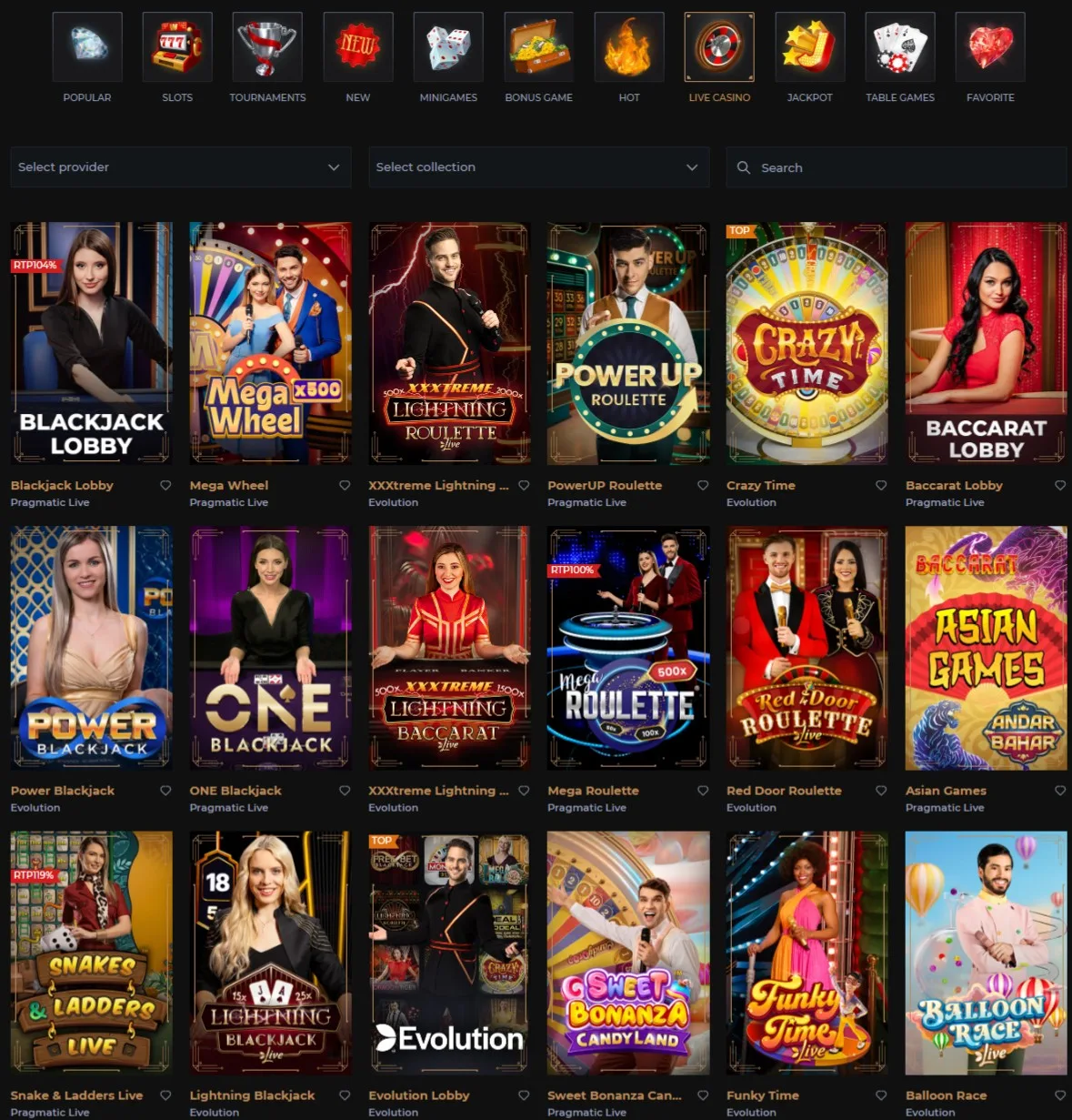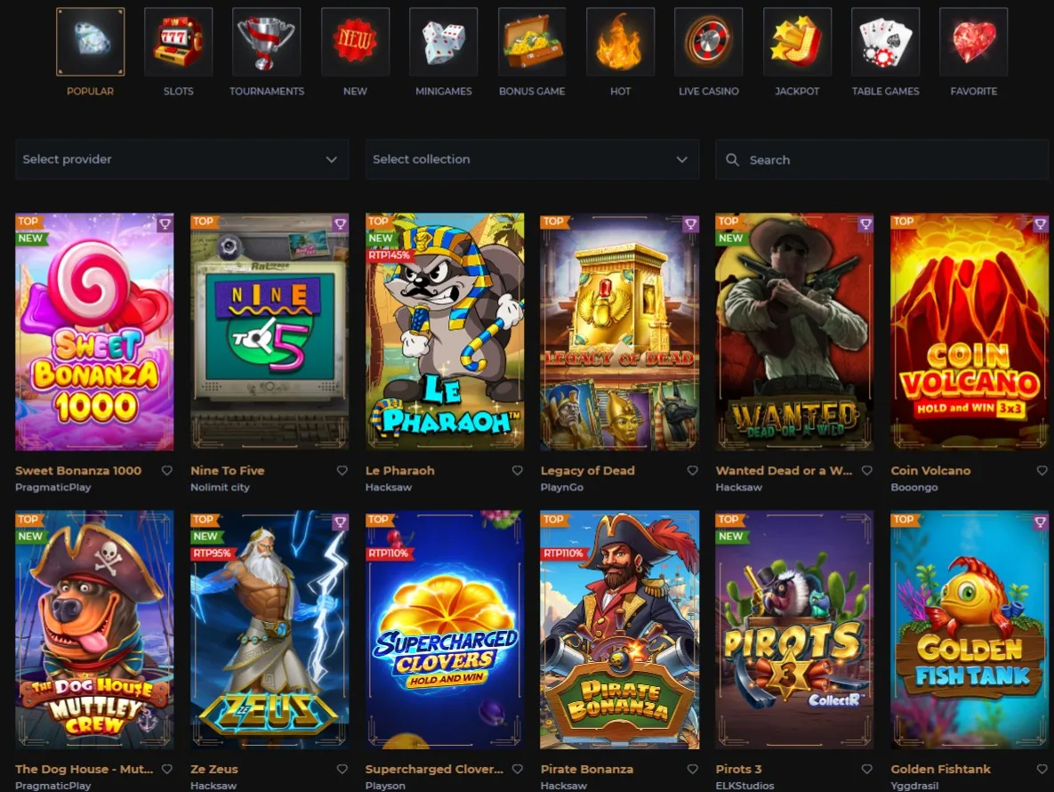The site is well-organized, with easy navigation through various game categories. Players can use the search function, filter by game provider, or select from collections like high-volatility games or Megaways slots. This user-friendly design ensures that players can quickly find their favorite games or discover new ones.