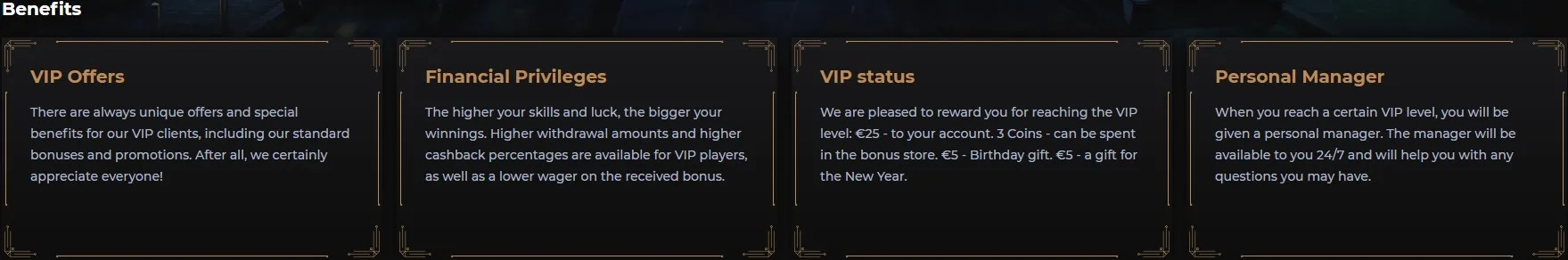Each level offers increasingly better rewards, such as higher cashback percentages, personal account managers, and exclusive bonuses. The highest level, DON, provides a 25% unlimited cashback on lost deposits and access to exclusive daily bonuses.