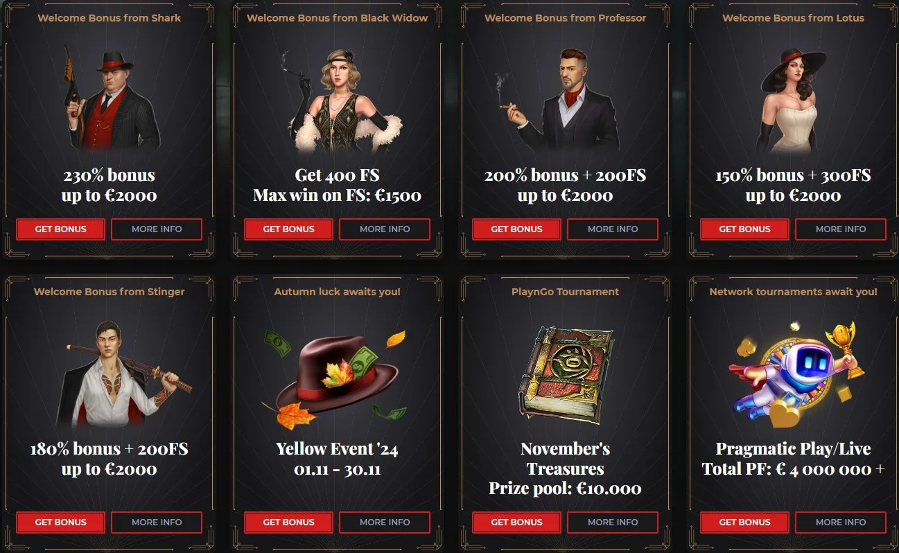 New players can choose from five different welcome packages, each consisting of a three-part bonus that includes match bonuses, free spins, or a combination of both. For example, players can select a gangster character who offers a specific welcome bonus, such as the Black Widow bonus which comes with 400 free spins. These bonuses are subject to wagering requirements, typically around 40x on slots.